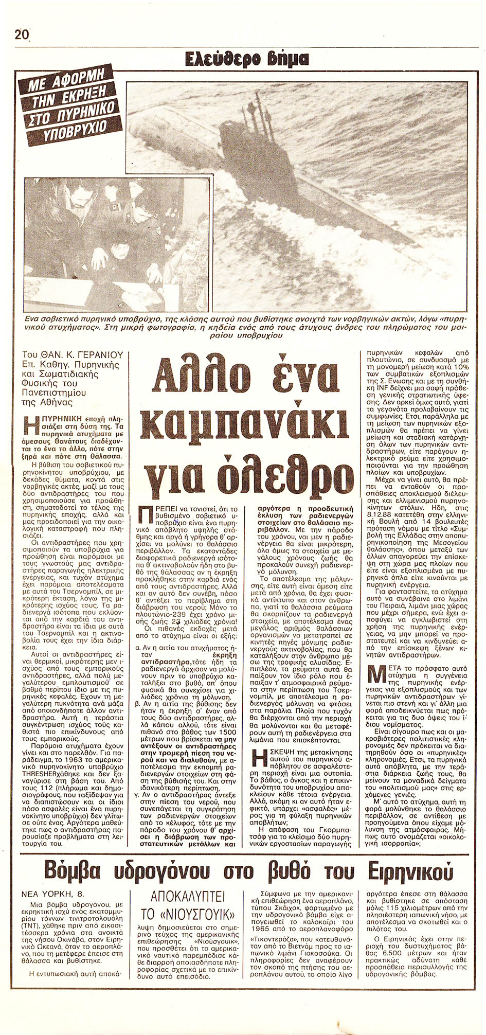 » Αρθρο στην εφημερίδα ΤΟ ΒΗΜΑ ΤΗΣ ΚΥΡΙΑΚΗΣ 27.4.1997, σελ. Α34-Α35 με θέμα, "Το Chernobyl μας απειλεί ακόμη"