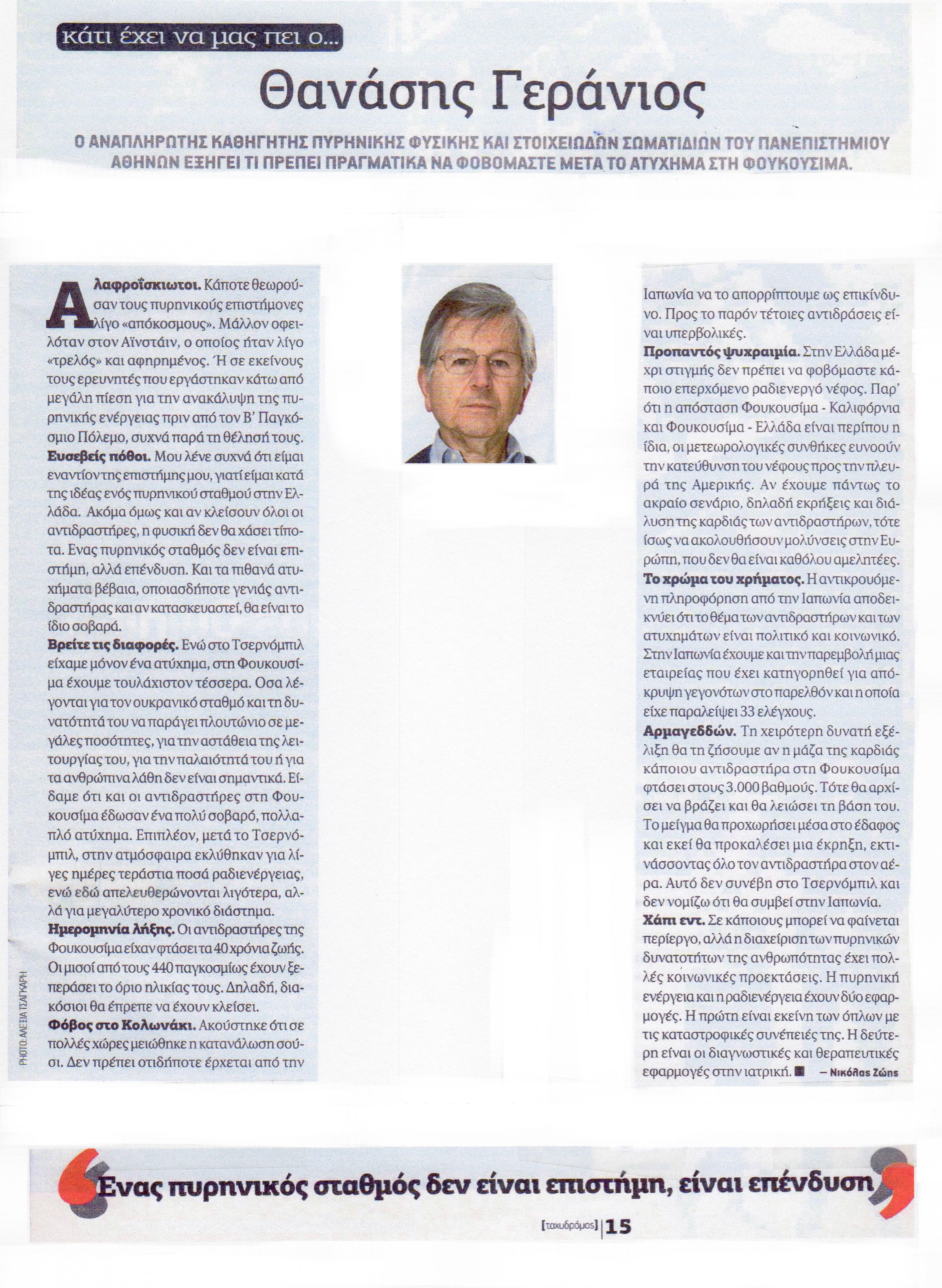 » Συνέντευξη στον ΤΑΧΥΔΡΟΜΟ στο δημοσιογράφο Ν. Ζώη με θέμα το πυρηνικό ατύχημα στη Fukushima, 2.4.2011
