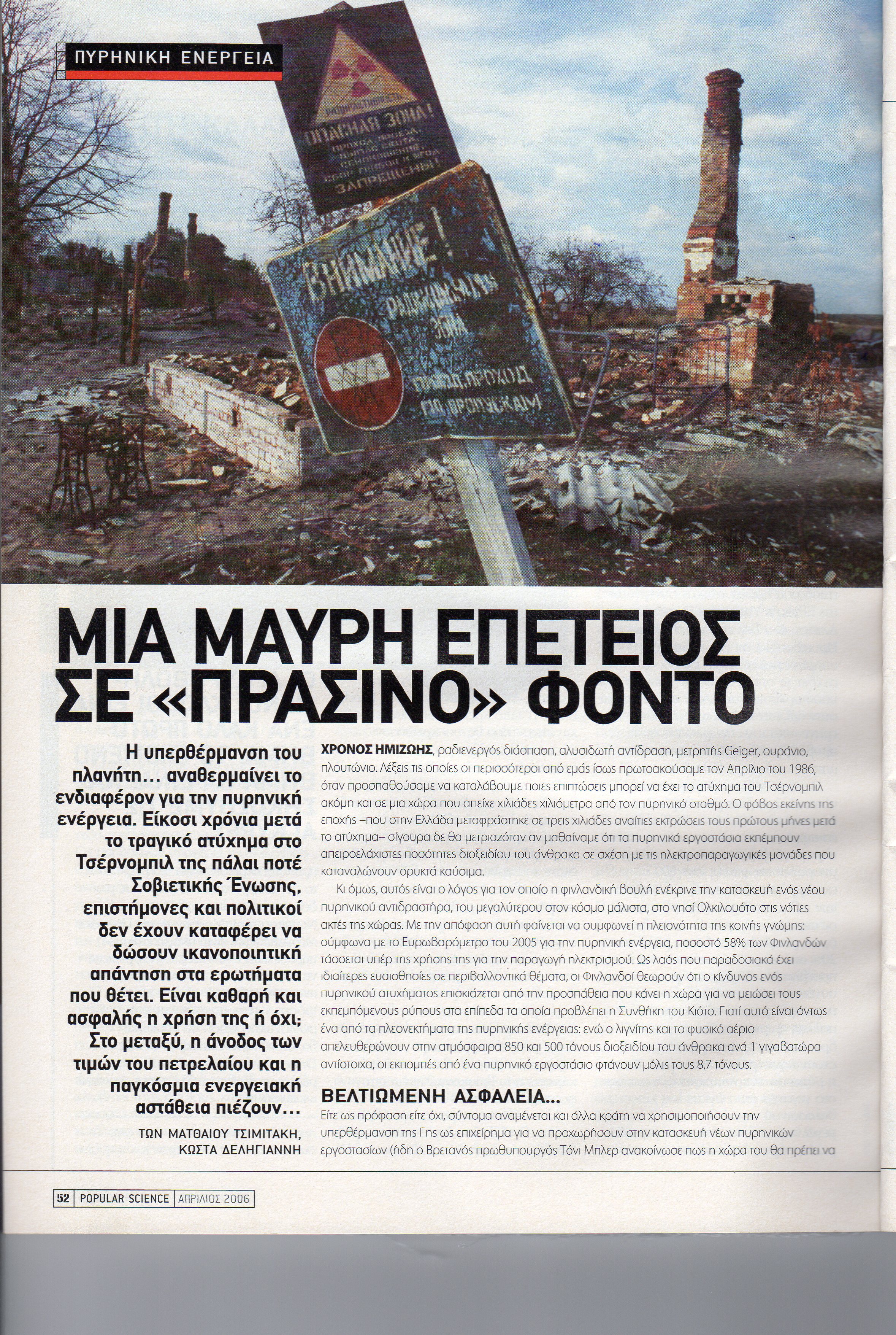 » Συνέντευξη στην ΚΑΘΗΜΕΡΙΝΗ- Popular Science στον Μ. Τσιμιτάκη με θέμα Chernobyl, προοπτική πυρηνικών αντιδραστήρων, Α, Β, C, 1.4.2006, σελ. 53-54.