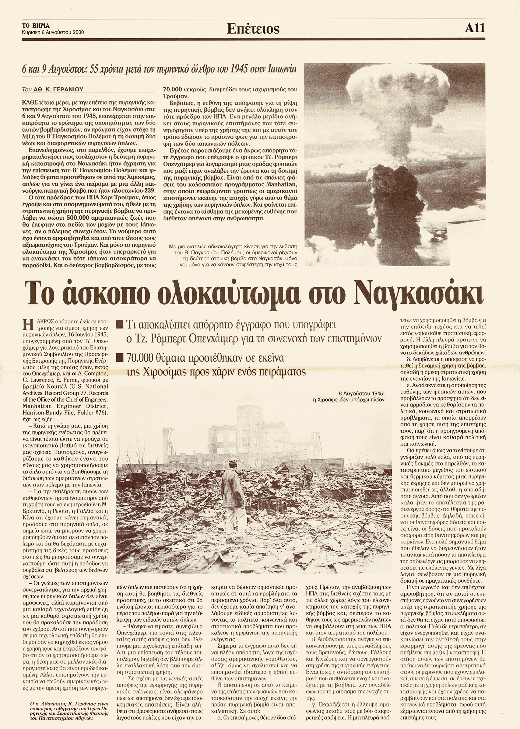 » Αρθρο στο ΒΗΜΑ ΤΗΣ ΚΥΡΙΑΚΗΣ σελ. Α11 με θέμα Το άσκοπο ολοκαύτωμα στο Ναγκασάκι,  6.8.2000